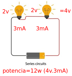 Todos los componentes estan en la misma linea, si tenemos 2 leds y cada uno necesita 2v y 3mA para funcionar, en total este circuito necesita la suma de los voltios y la corriente se mantiene o el consumo siempre es el mismo.