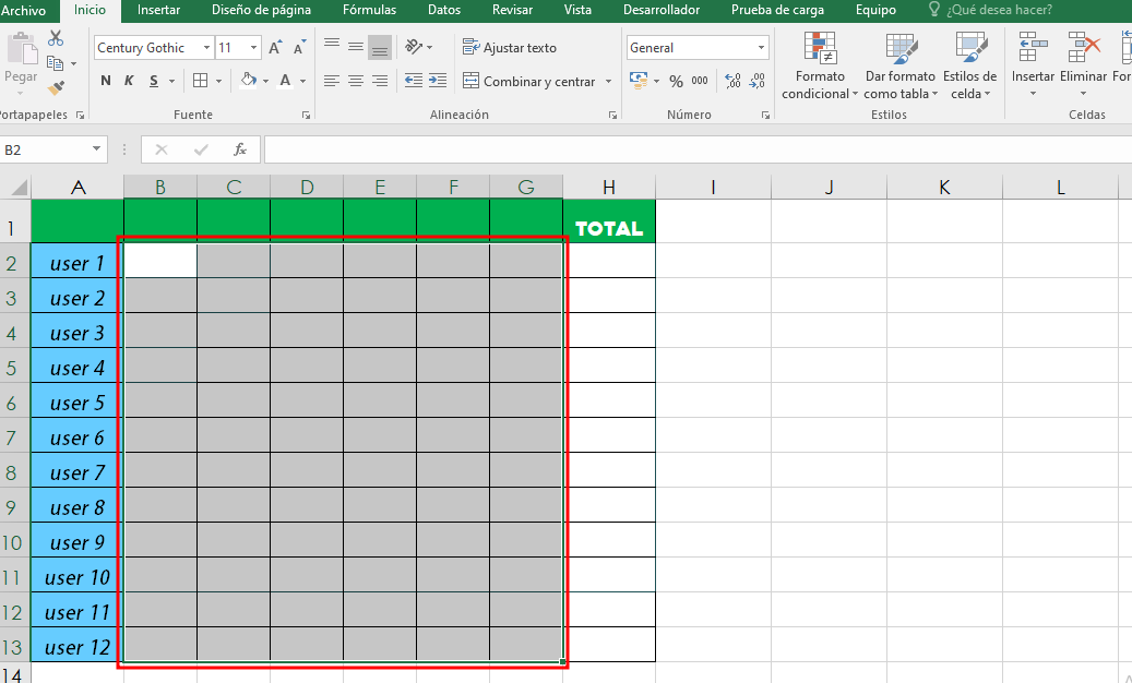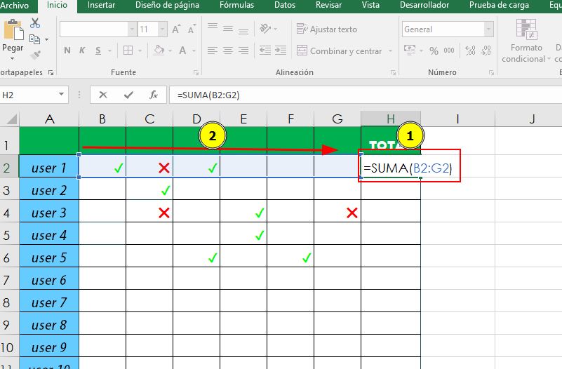 - Seleccionamos todos los campos de esa fila, se nos agrega las posiciones automaticamente en nuestra funcion “=SUMA(B2:G2)”