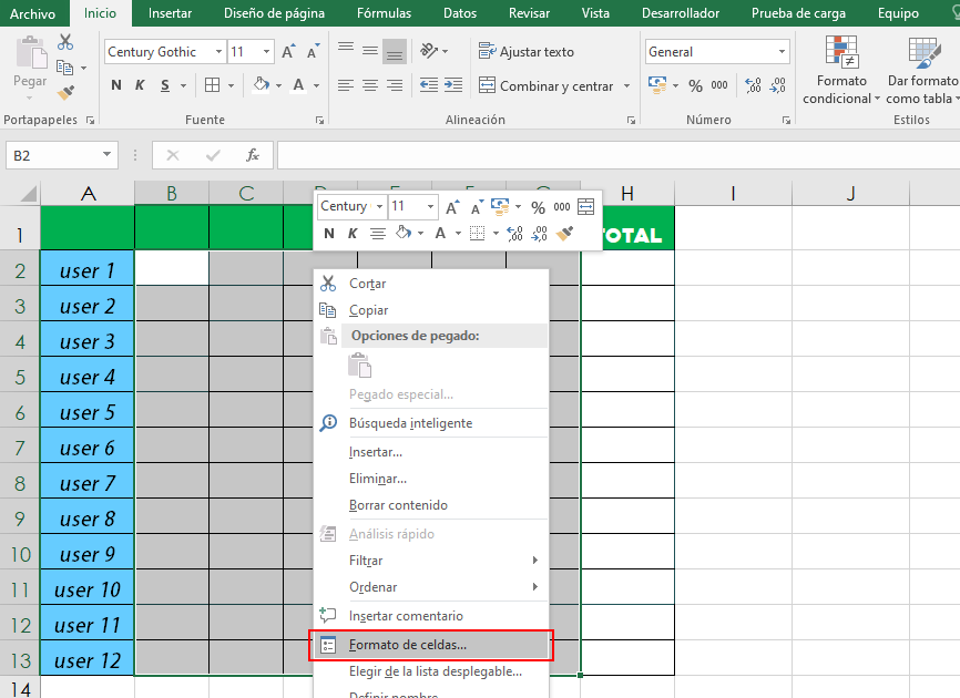 3. Click derecho y seleccionamos “Formato de celdas…”.